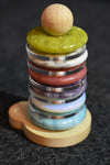 Das Set besteht aus Holzsockel mit Holzstab + Holzkugel + 5 Acrylscheiben.
